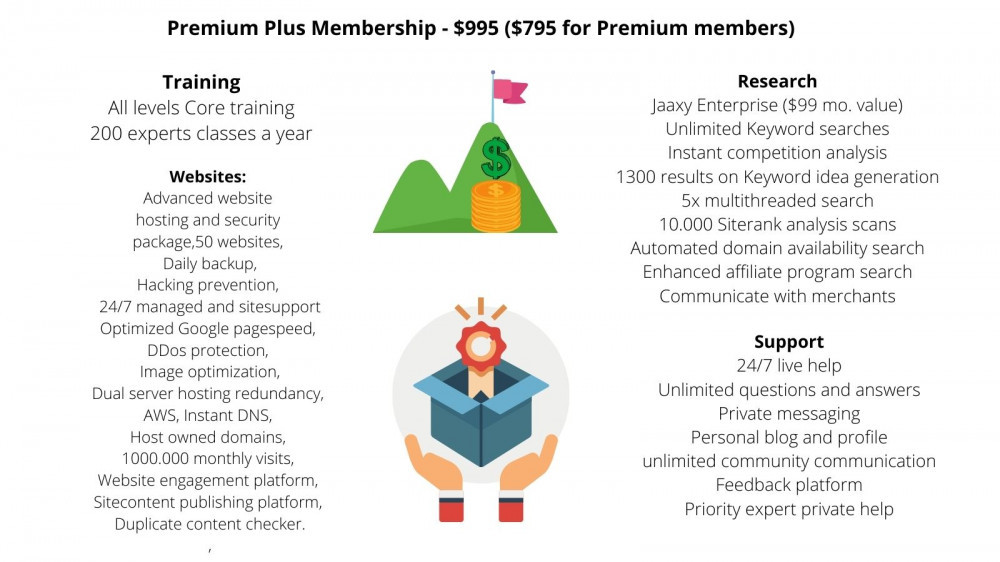 10 websites you can monetize and earn from, expert help and mentor, hosting on the world's most secure servers. No downtime. 50 online entrepreneur lessons and 70 affiliate marketing lessons. And a super supporting community.